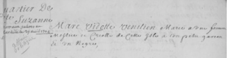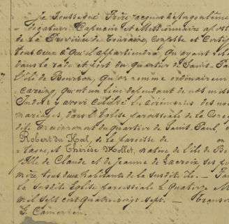 Du Hal Robert et Mollet Thérèse. 14 mars 1687. N°_3 — Je soussigné Frère Jacques d’Angoulême, Prédicateur Capucin et Missionnaire apostolique, de la Province de Touraine, confesse et certifie à tous ceux à qui il appartiendra, qu’ayant relâché dans la rade et port du quartier de Saint-Paul, dans l’île de Bourbon, qu’on nomme ordinairement Mascareing, qu’est un lieu dépendant de nos missions des Indes, y avoir célébré les cérémonies des noces et mariages, dans l’Eglise paroissiale de la Conception, dite anciennement du quartier de Saint-Paul, entre Robert du Hal, de la paroisse de [un blanc] en Bretagne, et Thérèse Mollet, native de l’île de Bourbon, fille de Claude et de Jeanne de Lacroix, ses père et mère, tous deux habitants de la susdite île — Fait dans la susdite Église paroissiale le quatorze mars mil sept cent quatre-vingt-sept — Transcrit par G. Camenhen