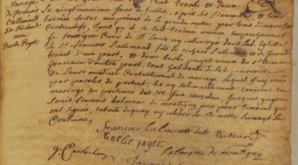Acte de mariage de François LALLEMAND et de Barbe PAYET (Archives départementales de La Réunion)