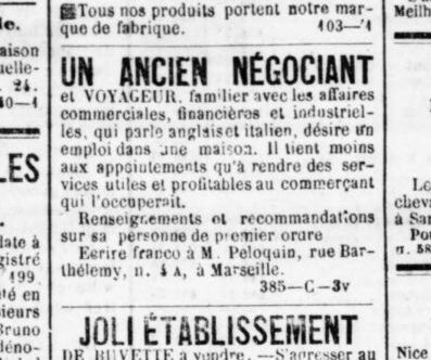 Nous vivons de mes rentes, mais je ne me résous pas à l’inactivité. En 1863, je fais paraître l’annonce ci-dessous dans Le Sémaphore de Marseille.