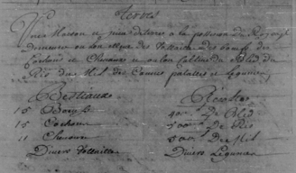 Recoltes — 400 L de bled, 500 L de ris, 500 L de mil, divers legumes [Notes : L = livres ; mil = maïs]