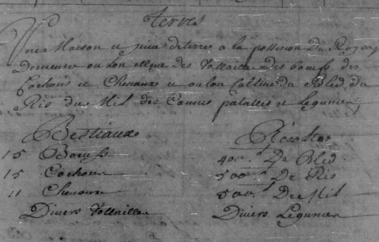Terres — Une maison et piece de terre a la possession du Roy ou il demeure ou lon eleve des vollailles, des bœufs, des cochons et chevaux et ou lon cultive du bled, du ris, du mil, des cannes, patates et légumes