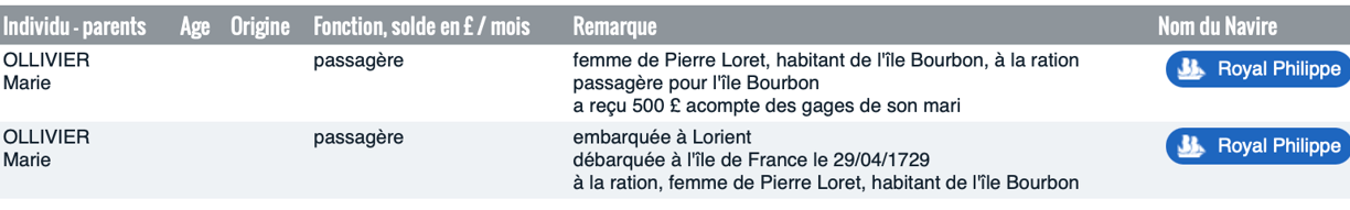 Marie ne rejoint Pierre qu’un an et demi plus tard. Elle quitte Lorient le 24 novembre 1728 sur le Royal Philippe en partance pour l’Inde. Elle voyage comme passagère « à la ration » et reçoit 500 £ d’acompte sur les gages de son époux.