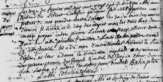 Le premier acte de mariage se trouve bizarrement à la toute fin du registre de 1726 et non à sa place logique, avec les autres actes de février. Il peut s’agir d’une recopie, pour réparer un oubli. Il arrivait à l’époque que des actes soient enregistrés sur des morceaux de papier pour ne pas les oublier (comme des « post it » avant l’heure !) ou ajoutés dans la marge ou au début de l’année suivante.