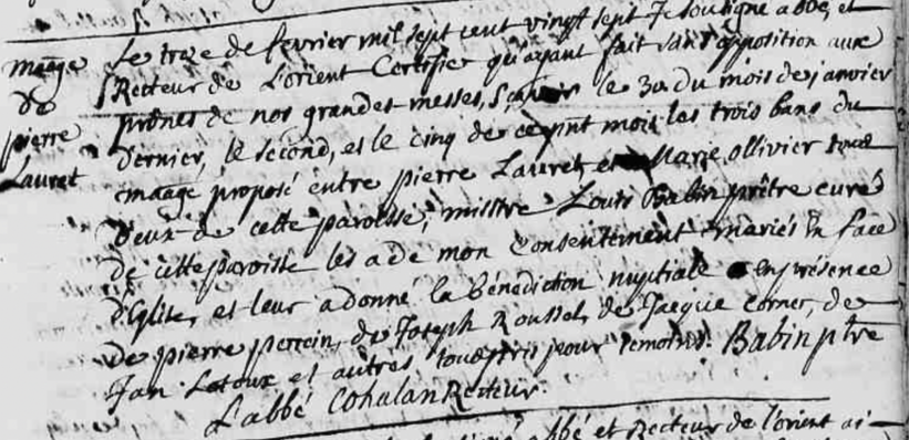 Mais, ô surprise ! Un an plus tard, le 13 février 1727, quasiment jour pour jour après leur mariage, Pierre LAURET et Marie OLIVIER convolent à nouveau, dans la même paroisse de Lorient.